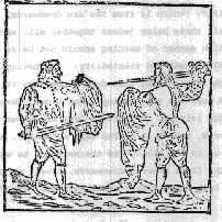 There be other some, whom it pleases to carry their Dagger with the flat towards the enemy, using for their defense, not only the Dagger, but also the guards thereof with the which (they say) they take holdfast of the enemy's sword : and to the end they may do it the more easily, they have daggers of purpose, which beside their ordinary hilts, have also two long sterts of Iron, four fingers length, and are distant from the dagger the thickness of a bowstring, into which distance, when it chances