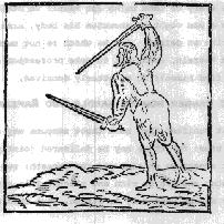 In the second way, which is framed with the right foot behind, the sword aloft, and the dagger before, and borne as aforesaid, he ought in like sort discharge a thrust as forcible as he may, with the increase of a straight pace, staying himself in the low ward. Neither ought any man in the handling of these weapons to assure himself to deliver edgeblows, because he knows that there is an other weapon which defends : For he that defends has the self same advantage, to wit, to be able to with one weapon (and happily the weaker) to defend himself and strike with the stronger. The which stroke is painfully warded by him, who has already bestowed all his force and power, in delivering the said edgeblow, by means whereof, because there remains in him small power to withstand any great encounter, let him provide to thrust only.